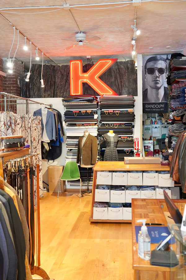 A clothing store interior with neatly stacked fabric rolls, assorted jackets on racks, and a counter with drawers. A red neon "K" sign is mounted on the wall. A mannequin wears a jacket and shirt. A large poster with sunglasses is on one wall. Antonio Smith, @antoniocdsmith